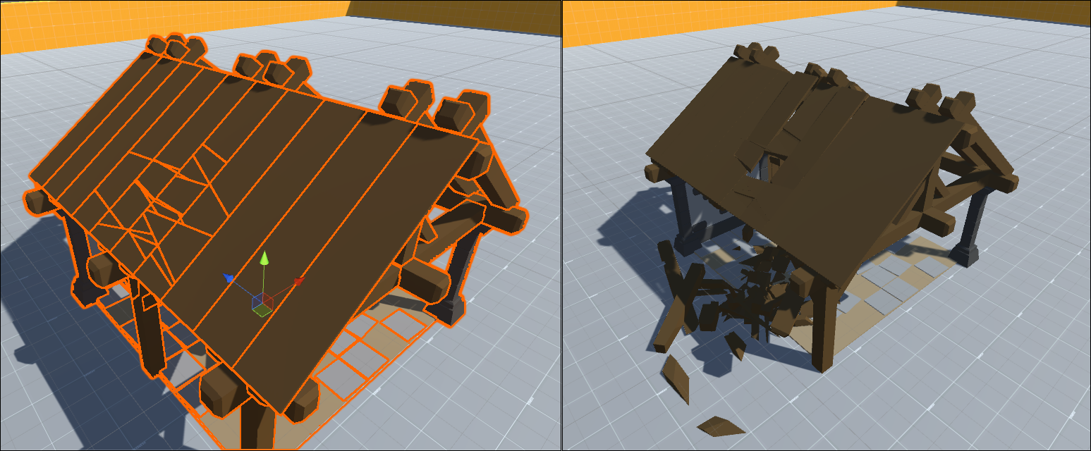 The topic of my Master’s Thesis is physical based destruction of objects in computer games. Espacially destruction which is caused by a fire in the game. The main idea was to develop a system that can calculate the movement of the fire, the dynamic destruction of geometry it causes and the way it behaves based on the physical material of the object. All this calculations are made in real time. To safe performance in the game itself an aditional goal was, that the system can safe the whole process as an animation. I developed this system in Unity 3D. The following pictures show some of the features and results.