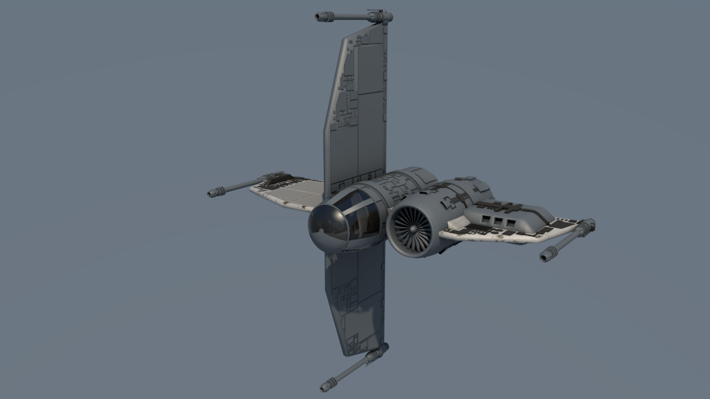 This is one of my work in progress projects. It’s a Star Wars inspired battle space ship like the A-Wing or the X-Wing. The B-Wing was an inspiration too, which is based on the cockpit/wing rotation principle. The whole ship can rotate around the cockpit cylinder and the two vertical wings can tilt on the horizontal wing to minimize the size of the space ship.